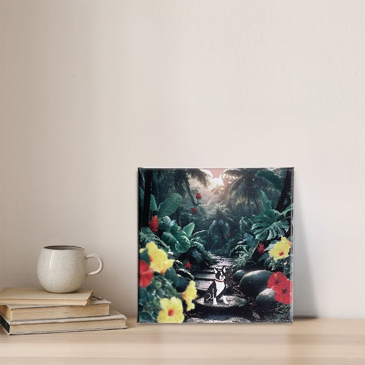 ボストンテリアが熱帯の楽園にいるかのような心惹かれる一枚です。